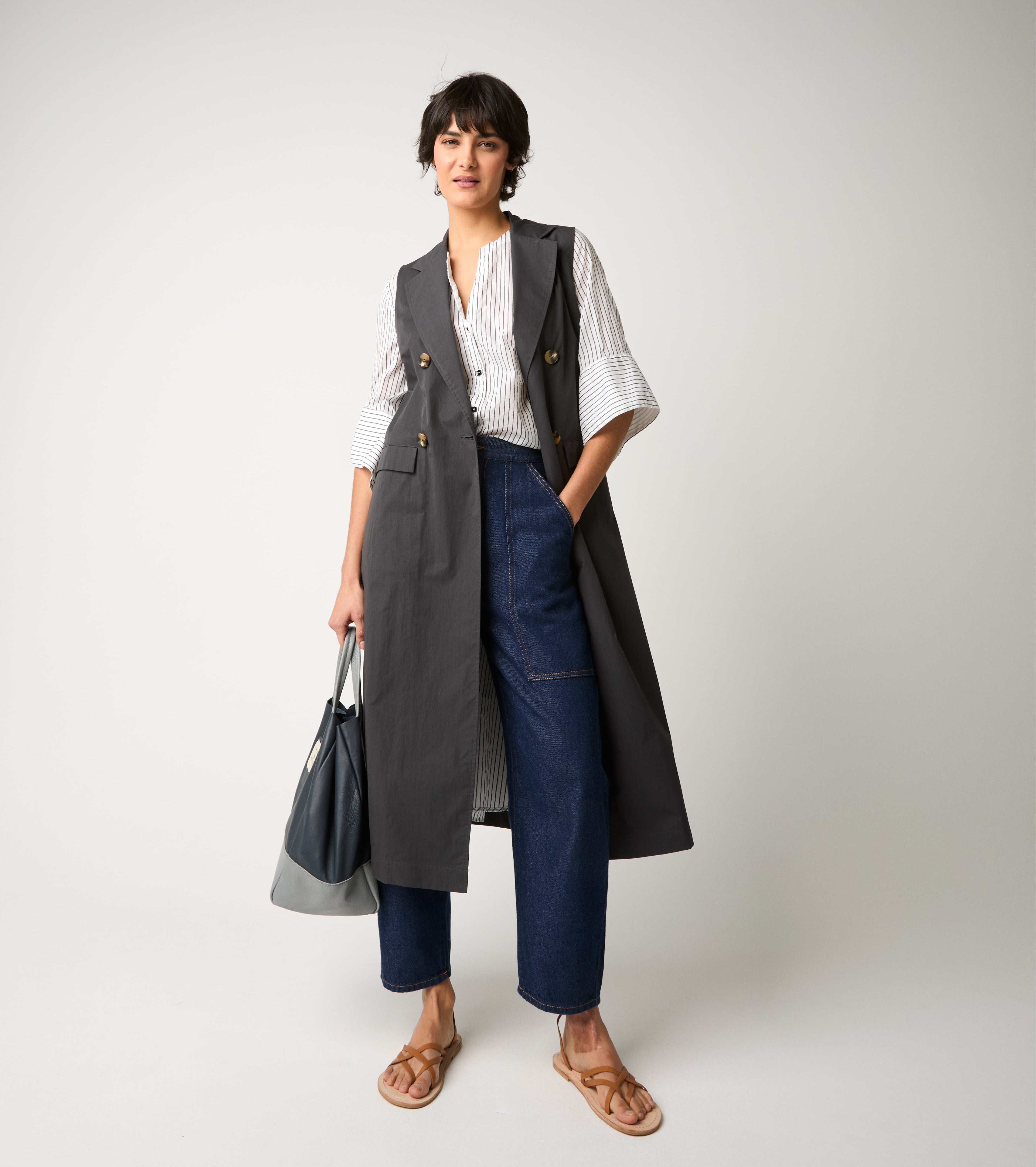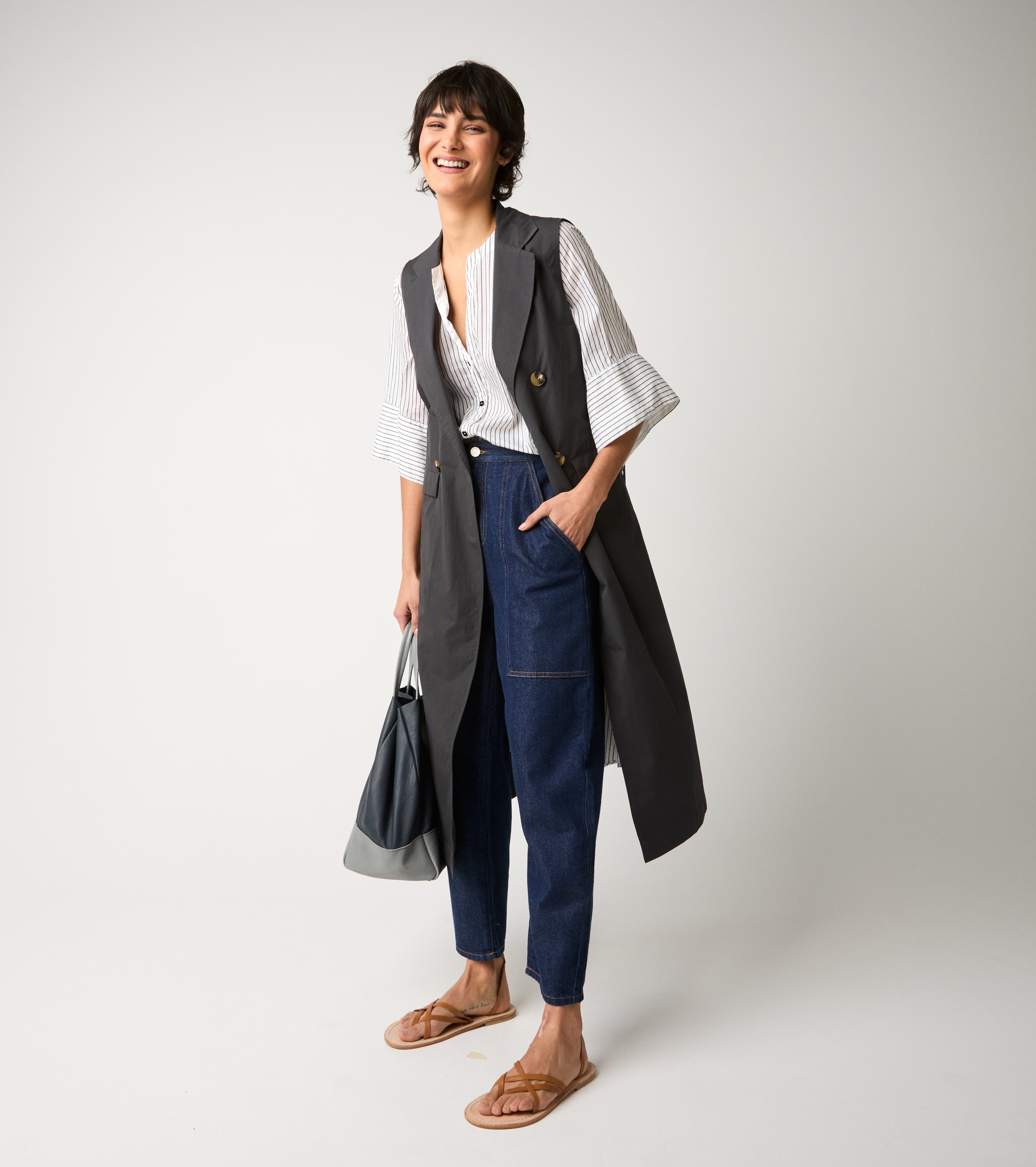 Scopri il fascino primaverile di questo gilet lungo dal design trench e indossalo con i pantaloni cropped a palazzo e l'abito in maglia jacquard. Completa lo styling con una borsa a spalla dal design capiente e sei pronta per un weekend rilassante o una passeggiata al parco.