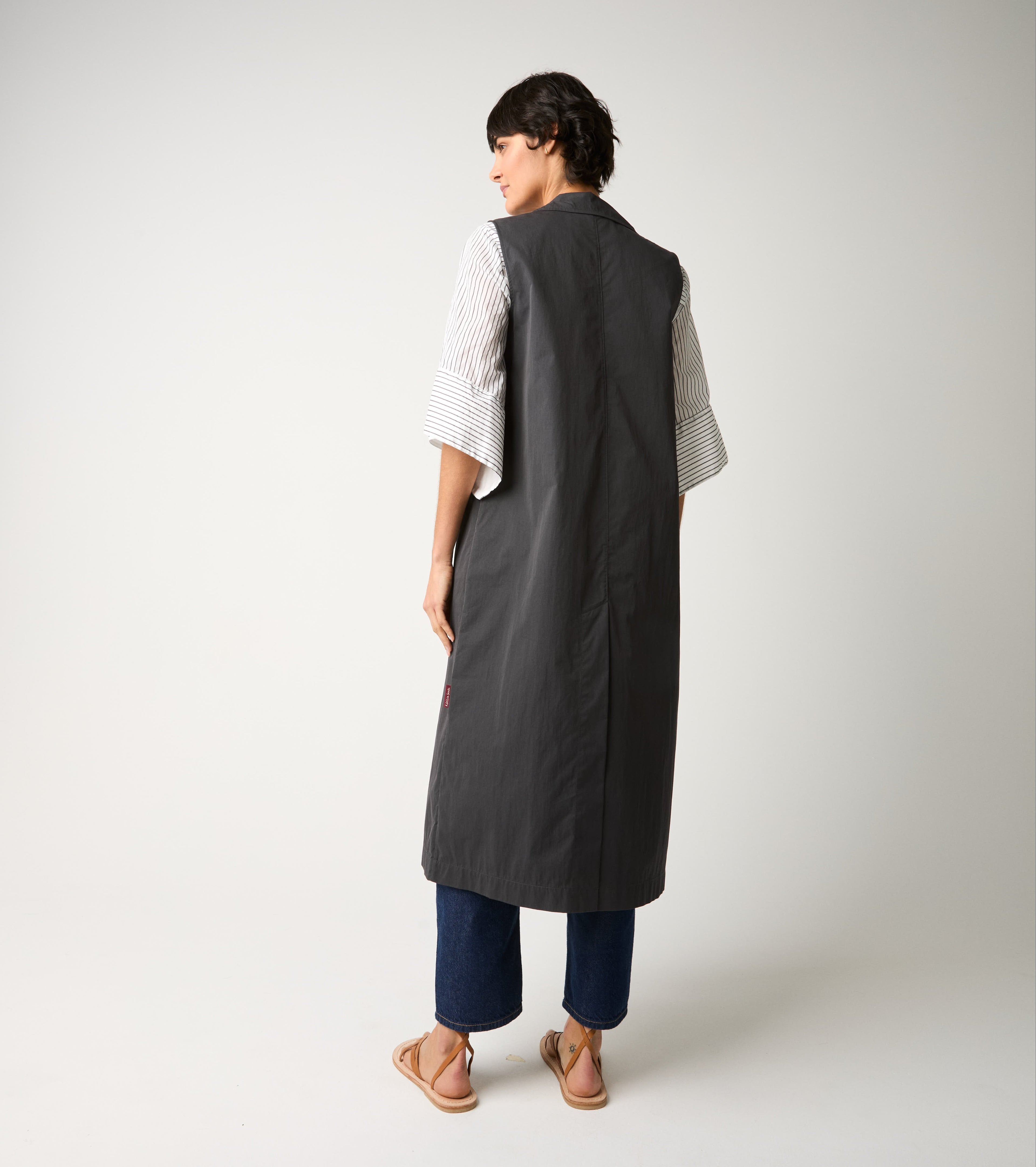 Scegli il gilet lungo d'ispirazione trench realizzato in cotone tecnico antigoccia dalla texture leggera e resistente.