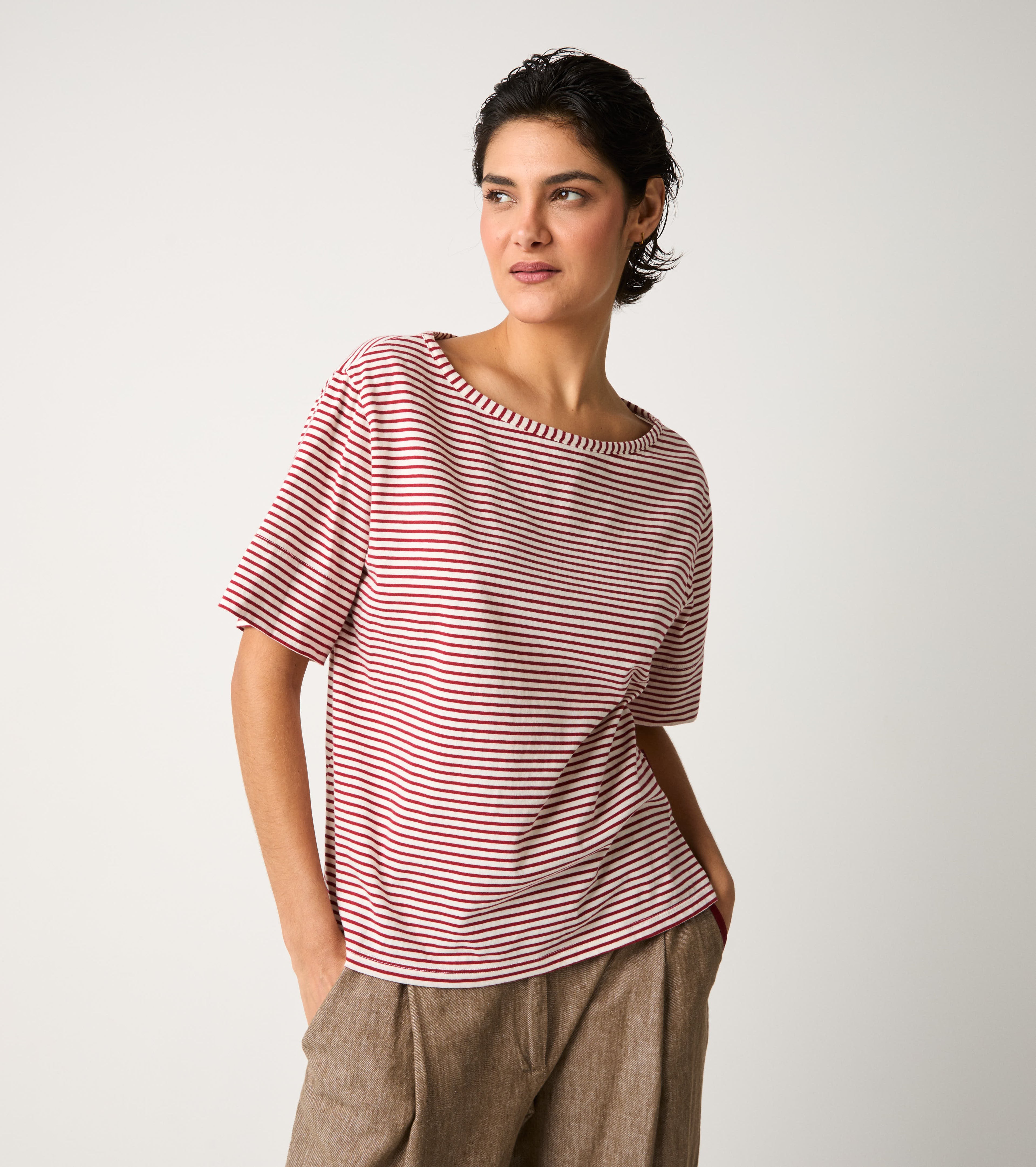 Con scollo a barca e maniche corte dal taglio morbido, è un must-have per i look quotidiani più sofisticati.