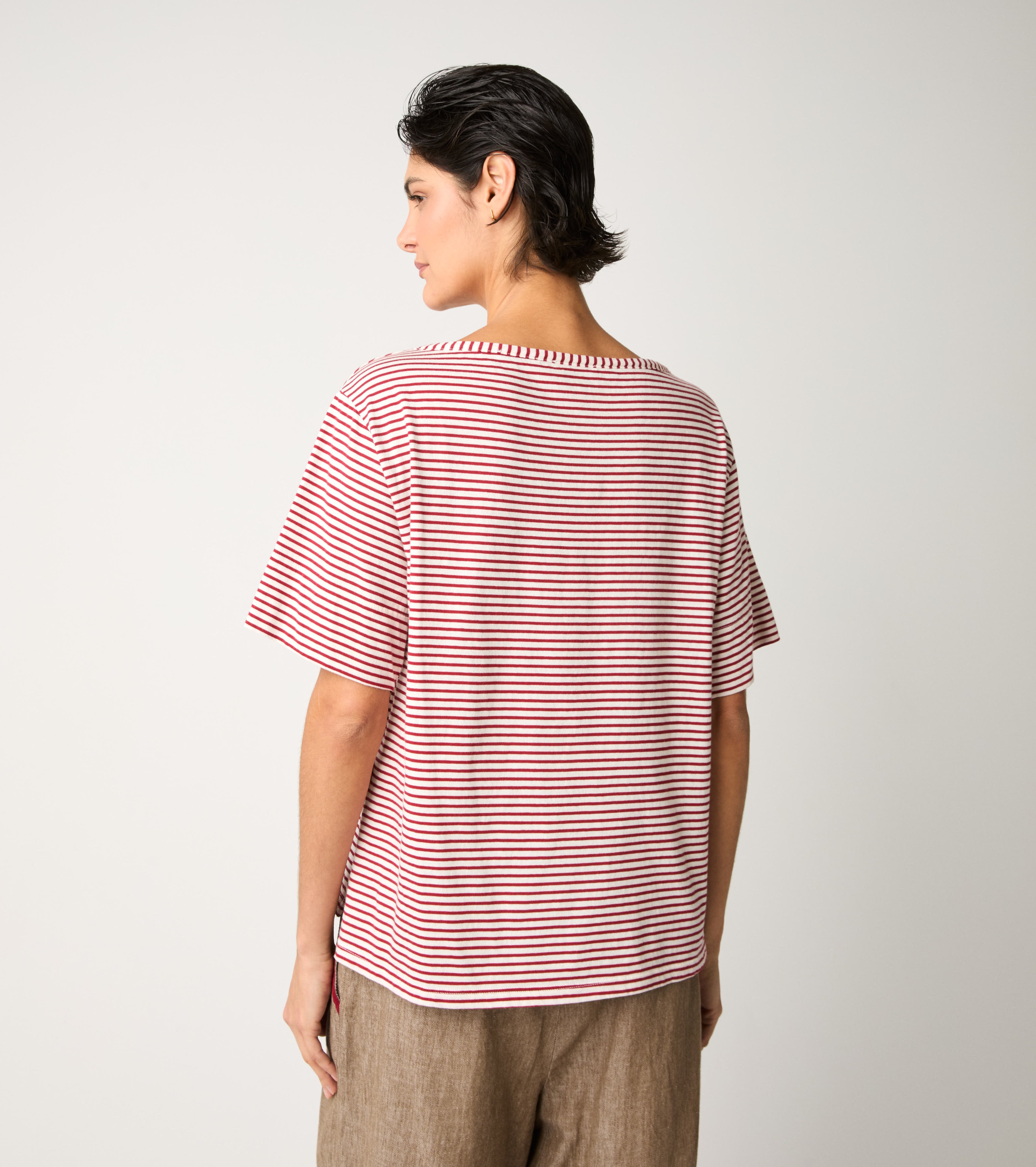 Scegli la t-shirt realizzata in jersey di cotone leggero e impreziosita con il classico motivo a righe d'ispirazione marinière.