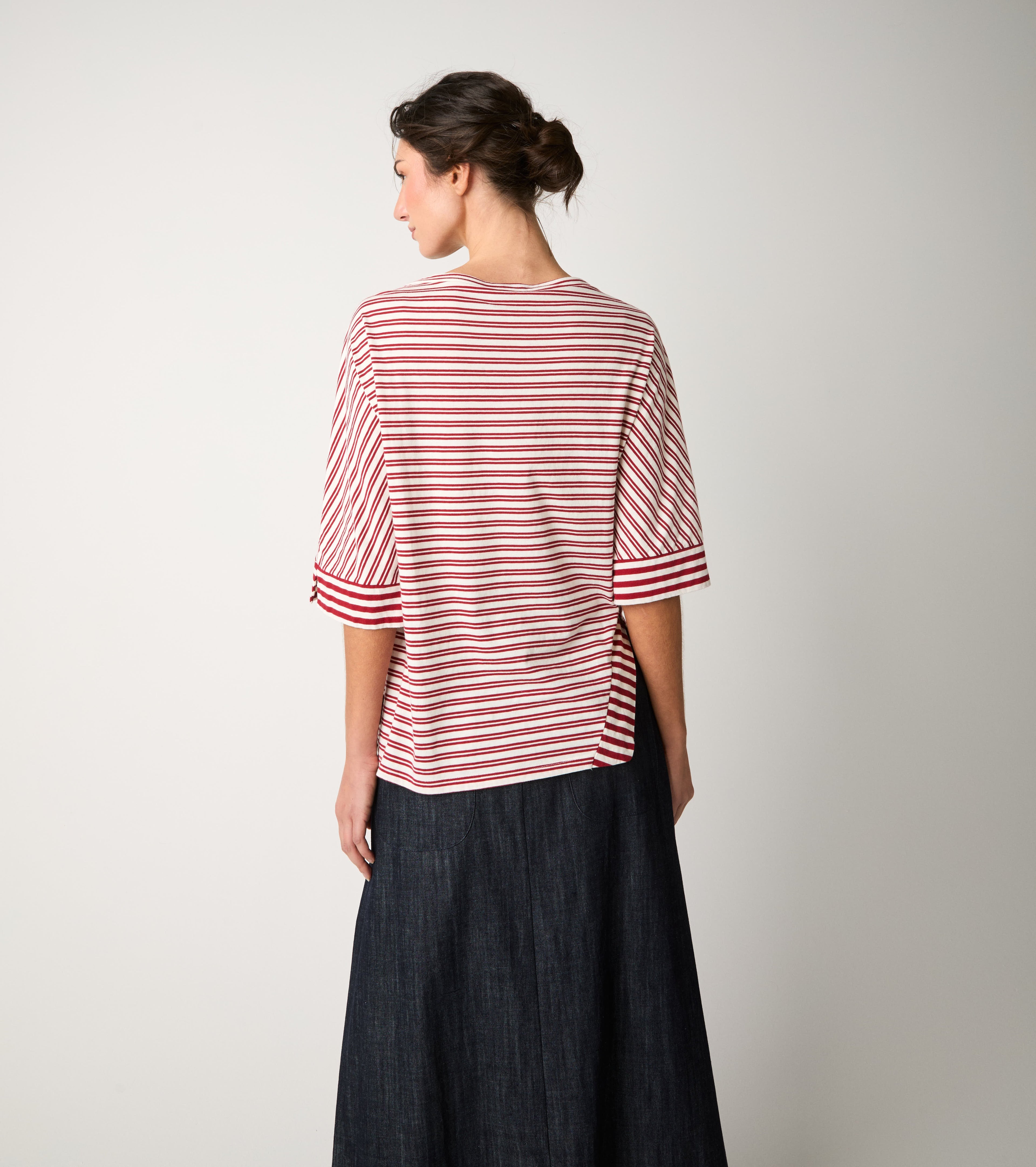 Scegli la t-shirt realizzata in jersey di cotone leggero e impreziosita dall'intramontabile motivo a righe d'ispirazione marinière.